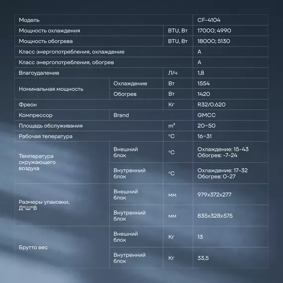 | Режимы работы | охлаждение/обогрев/вентиляция |