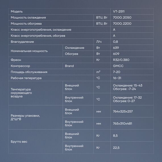 | Режимы работы | охлаждение/обогрев/вентиляция |