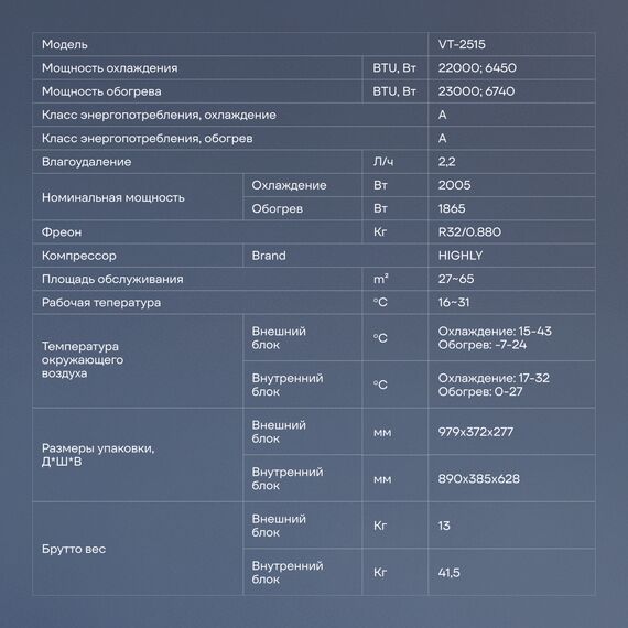 | Вес внешнего блока | 19.5 кг |