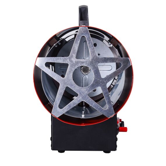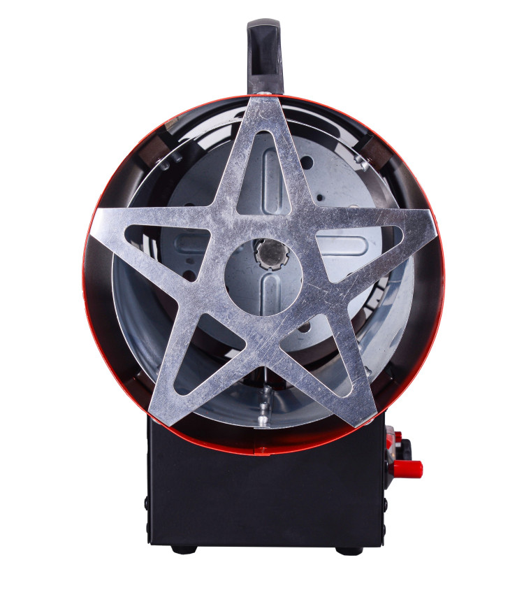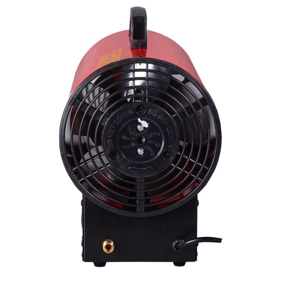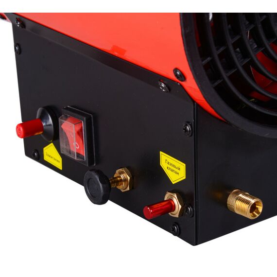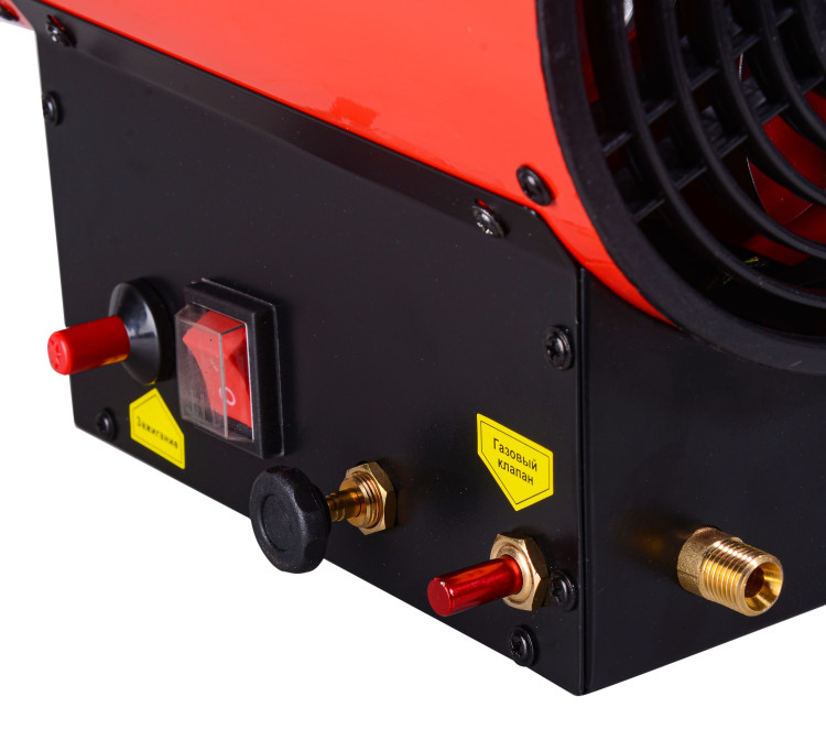 Сжиженный газ создает высокую температуру в камере сгорания тепловой пушки. Электрическая энергия однофазной сети необходима для работы вентилятора и функционирования автоматических узлов. Зажигание осуществляется с помощью пьезоэлектрического элемента. Теплопушка отличается экономичным расходом топлива 0,6-0,9 кг/час. Подача газа осуществляется под давлением 0,7 Бар. Контроль пламени происходит с помощью термодатчика из биметалла. Для обеспечения пожарной безопасности предусмотрена система защиты от перегрева. При отсоединении газового шланга тепловая пушка выполняет функцию вентилятора.