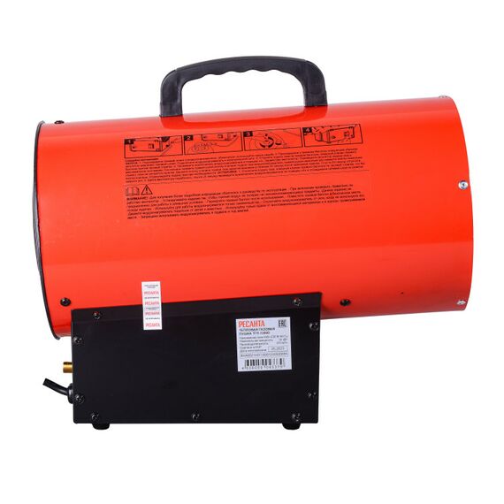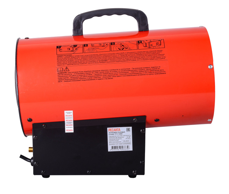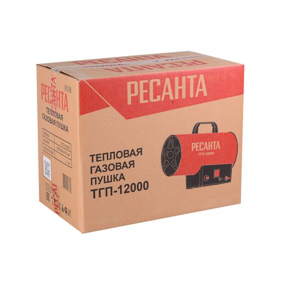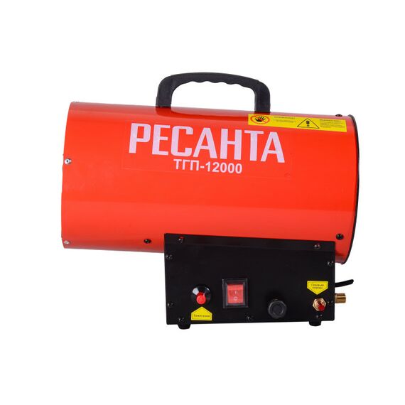 Газовая тепловая пушка Ресанта ТГП-12000 - эффективный нагреватель воздуха, использующий в качестве топлива сжиженные газы: пропан, пропан-бутан, бутан. Применяется для обогрева складских помещений, цехов, ремонтных мастерских площадью до 120 м², а также при монтаже натяжных потолков, для просушки окрашенных стен и штукатурки. Тепловая мощность имеет диапазон 7-12 кВт. Двигатель обеспечивает воздушный поток производительностью 370 м³/час.