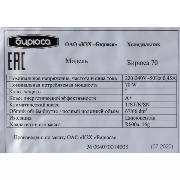 Холодильник Бирюса Б-70 1-нокамерн. белый мат