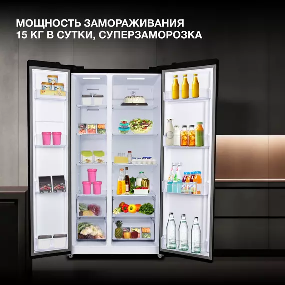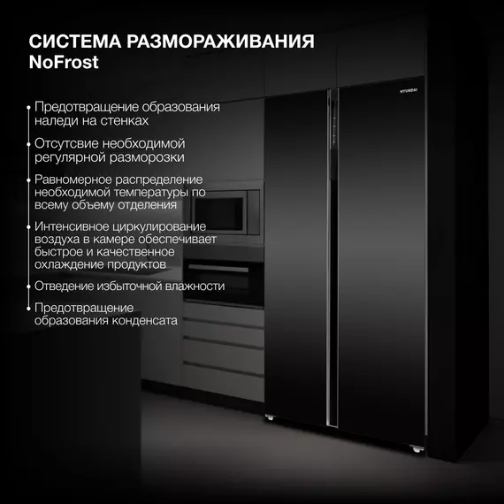 Холодильник Side-By-Side Hyundai CS6503FV с фасадами черное стекло – это сочетание эстетики, мощности и инноваций, созданное для тех, кто ценит комфорт, надежность и стиль в каждой детали дома.