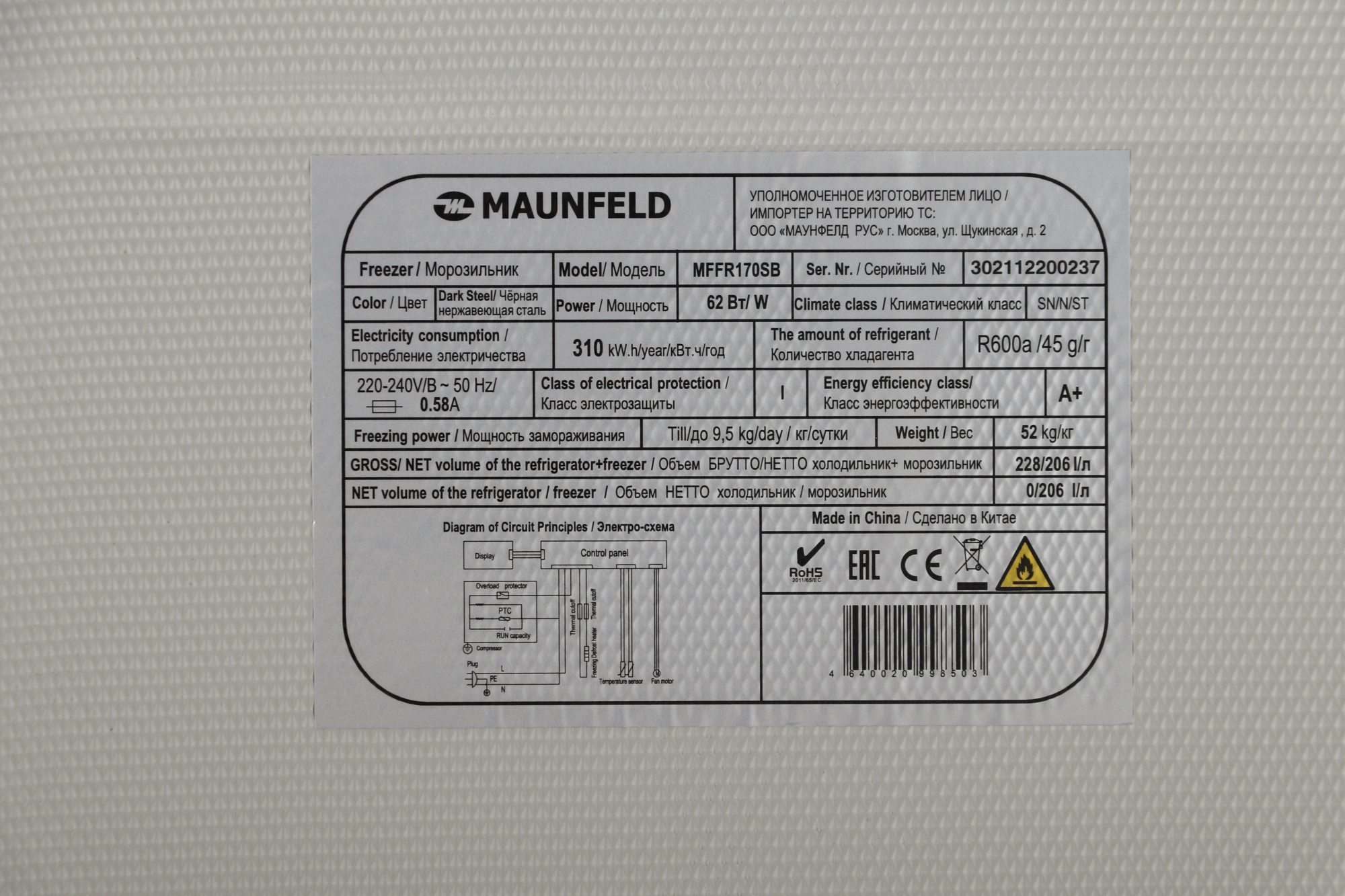 | Объем морозильной камеры | 206 л |