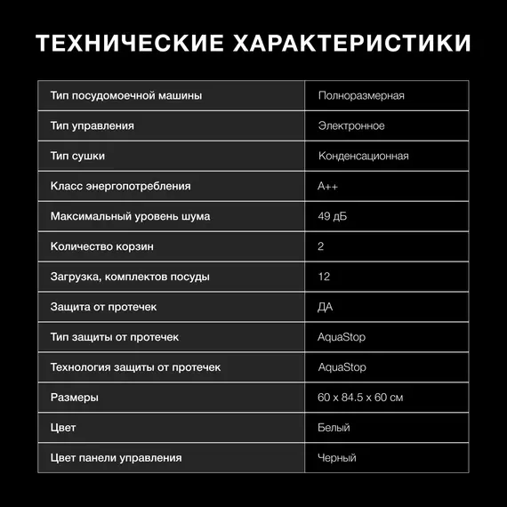 | Безопасность и управление | защита от детей, защита от протечек, таймер отсрочки запуска |