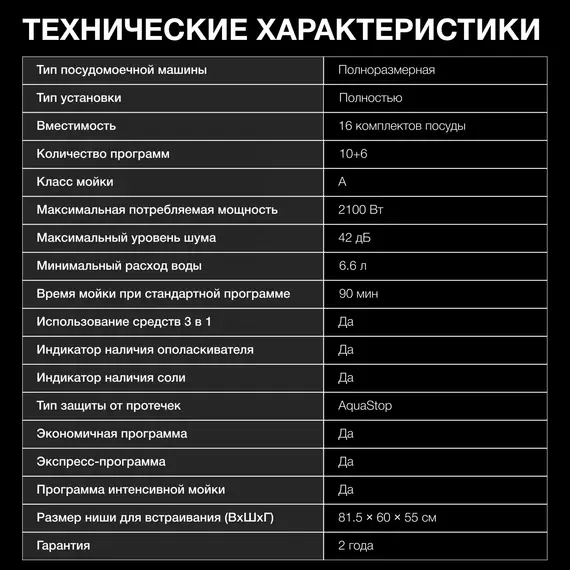 | Режимы и программы | интенсивная мойка, ночная программа, режим половинной загрузки, режим предварительного ополаскивания (замачивания), стандартная программа, экономичная мойка, экспресс-программа |