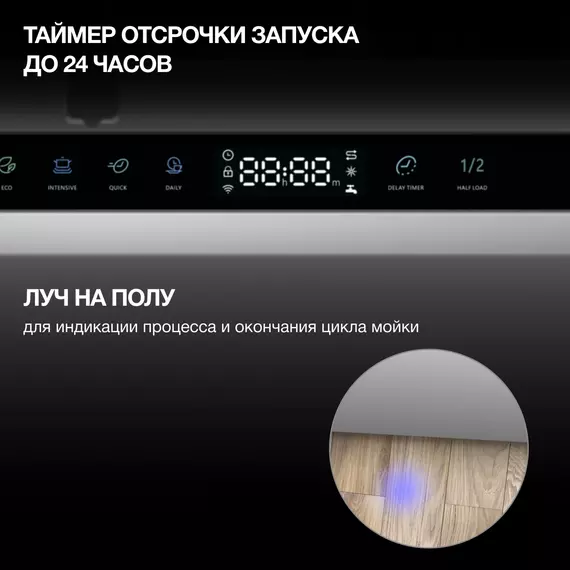| Индикация | луч на полу, наличия ополаскивателя, наличия соли |