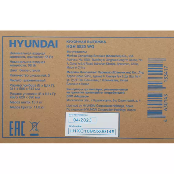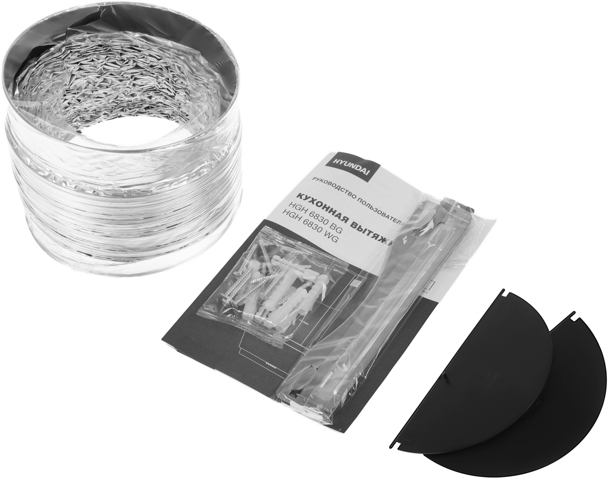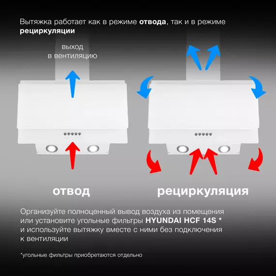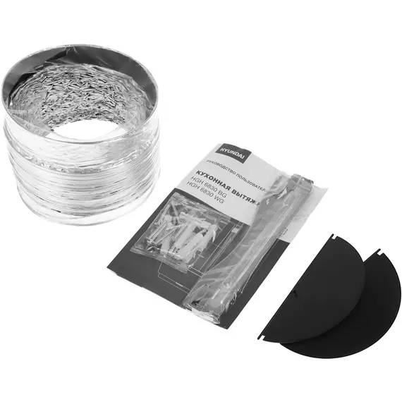 | Особенности | 2 декоративных кожуха по 40 см в комплекте, гофра в комплекте, подходит угольный фильтр HYUNDAI HCF 14S |