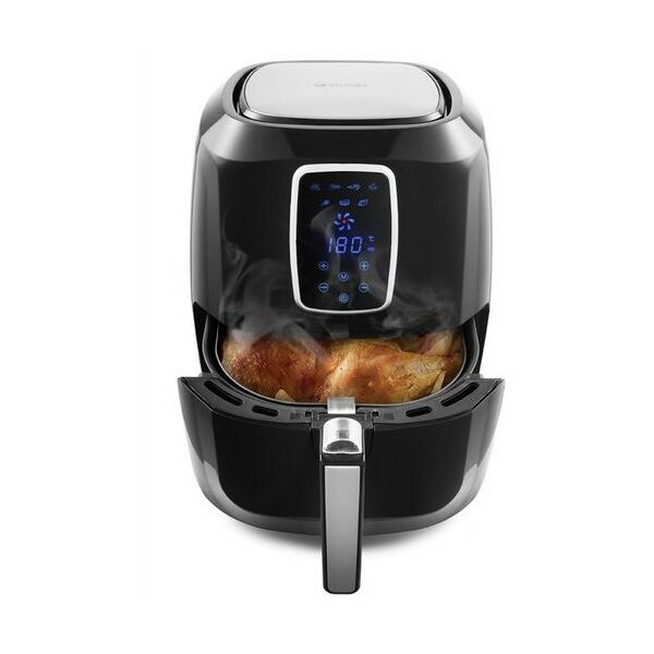 - Аэрогриль оснащен электронным управлением, он имеет 7 автоматических программ и дисплей Продукты готовятся в специальной корзине, которая вставлена в поддон с антипригарным покрытием