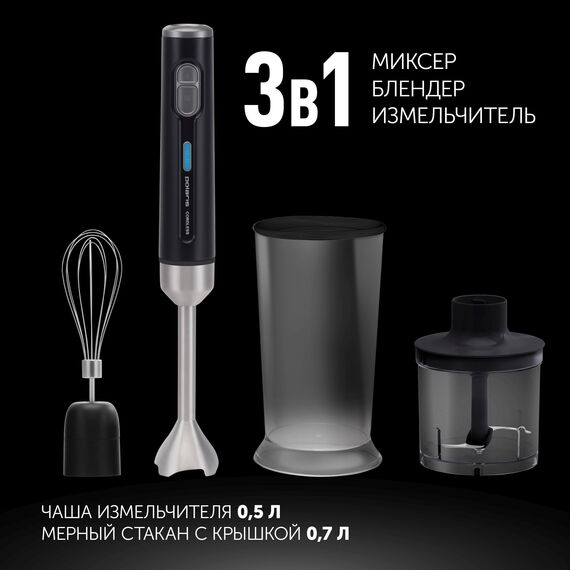 | Особенности | До 30 минут автономной работы. Время зарядки аккумулятора 5 часов. Чаща для измельчения 0,5 литра. Мерный стакан с крышкой объемом 0,7 литра. Аккумулятор: Li-ion 2000 мАч, 11,1 В. |