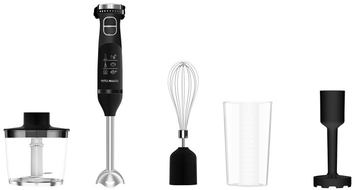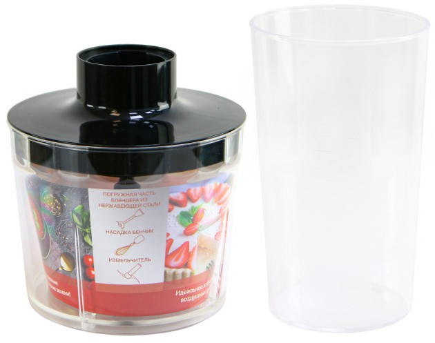 - В комплект к изделию входит стальная насадка измельчитель твёрдых продуктов – зелени, орехов или овощей, венчик для взбивания яичных белков, сливок, десертов и пластиковый стакан с мерной шкалой до 600 мл