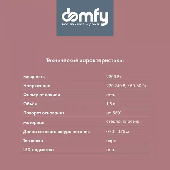 Стеклянный электрочайник DOMFY DSM-EK401 надежен, удобен и прост в эксплуатации благодаря удобному управлению, съемной крышке и возможностью поворота на основании. Наличие подсветки и прозрачный корпус обеспечивают эффектный внешний вид при включении в темноте.