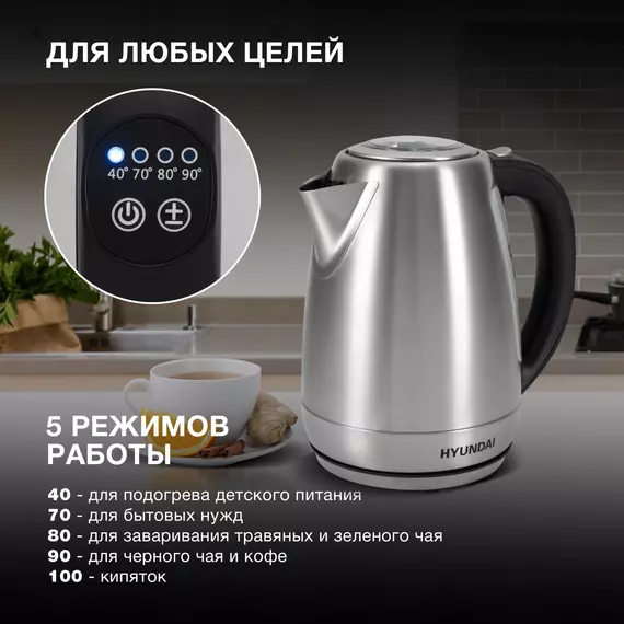 | Особенности | Чайник имеет 5 настраиваемых температурных режима для разных сортов чая, кофе, настоек и компотов, приготовления детского питания и других бытовых нужд. Температурные режимы: 40,70,80,90,100. |