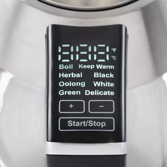 | Особенности | Информационный дисплей, сенсорное управление установками температуры 40-100С и функцией поддержания, для любых напитков и бытовых нужд. Широкий носик и фильтр от накипи. |