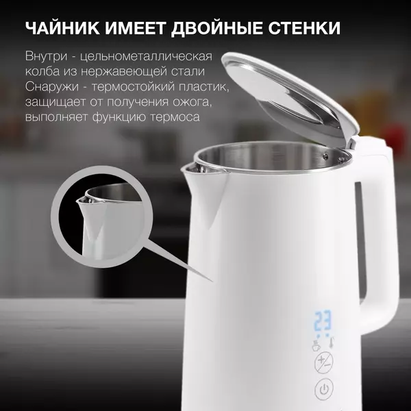 Особенности | Двойной теплоизолированный корпус. Внешний корпус из термостойкого пластика, защищает от случайного ожога при прикосновении. Внутренний корпус из нержавеющей стали, не впитывает и не выделяет примесей. Эффект термоса - температура воды в чайнике дольше остается теплой. |