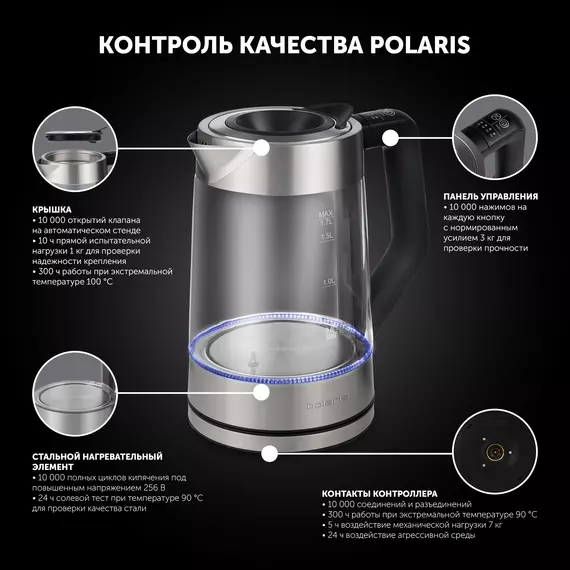 | Особенности2 | Подробная информация о работе чайника в приложении Polaris IQ Home: Загрузить в App Store, Загрузить в Google Play |