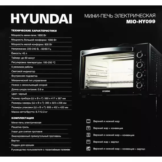 Мини-печь Hyundai MIO-HY099 45л. 1600Вт черный