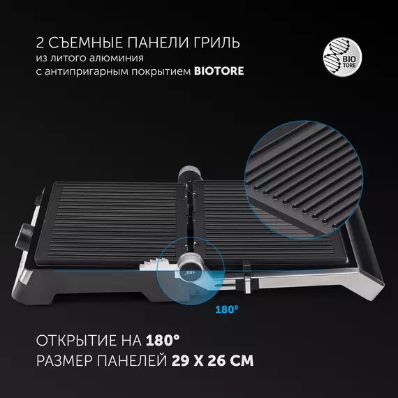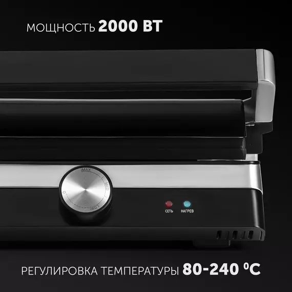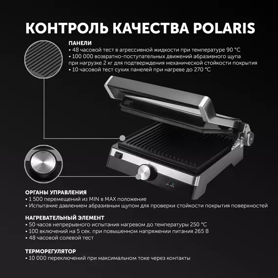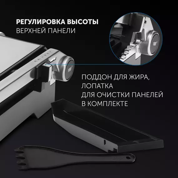 Кнопка высвобождения панелей для удобства использования. Рабочие поверхности имеют каналы для стекания жира в поддон. Лопатка для очистки панелей в комплекте. Регулировка высоты верхней панели. 2 индикатора работы.