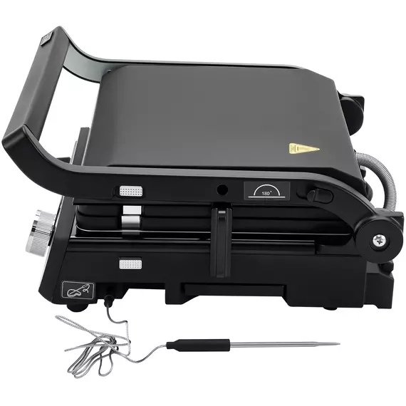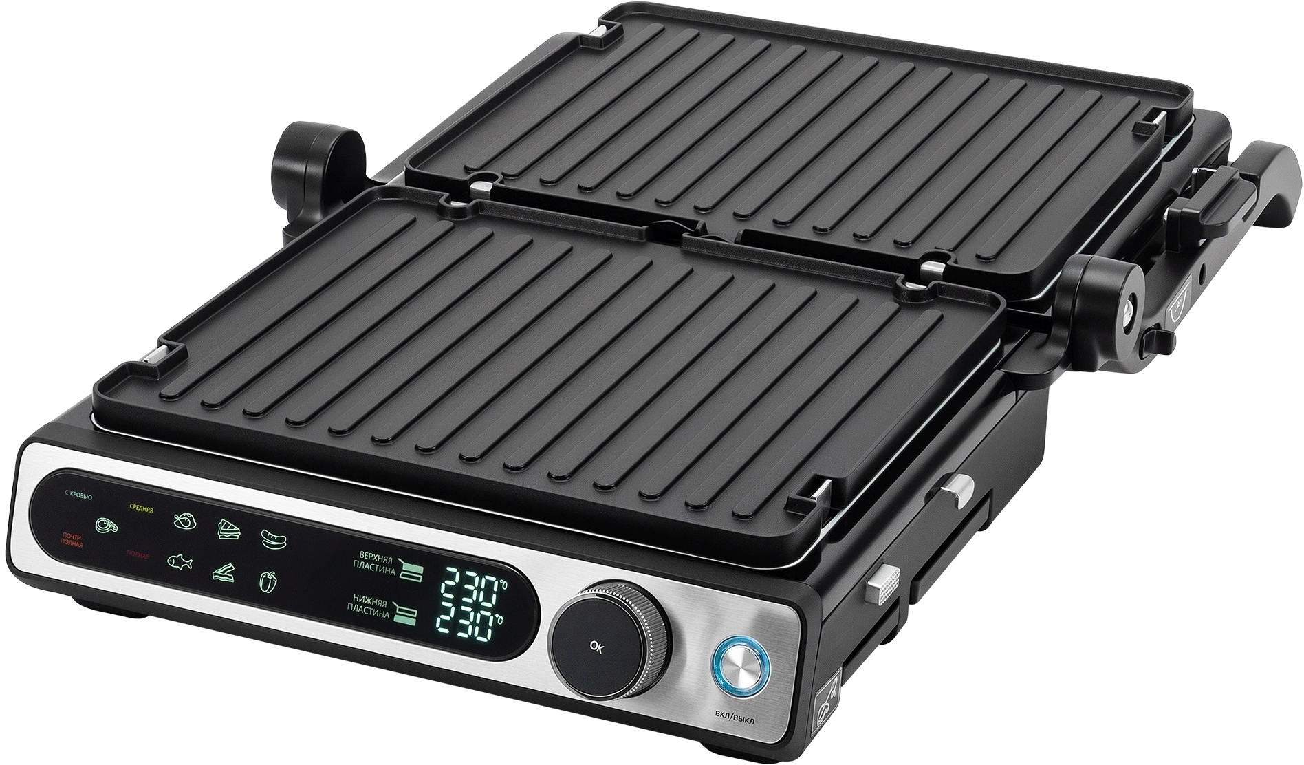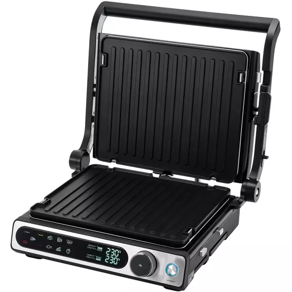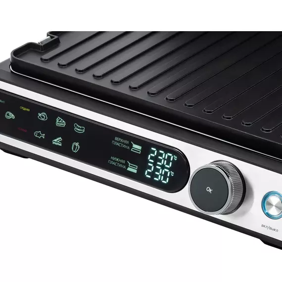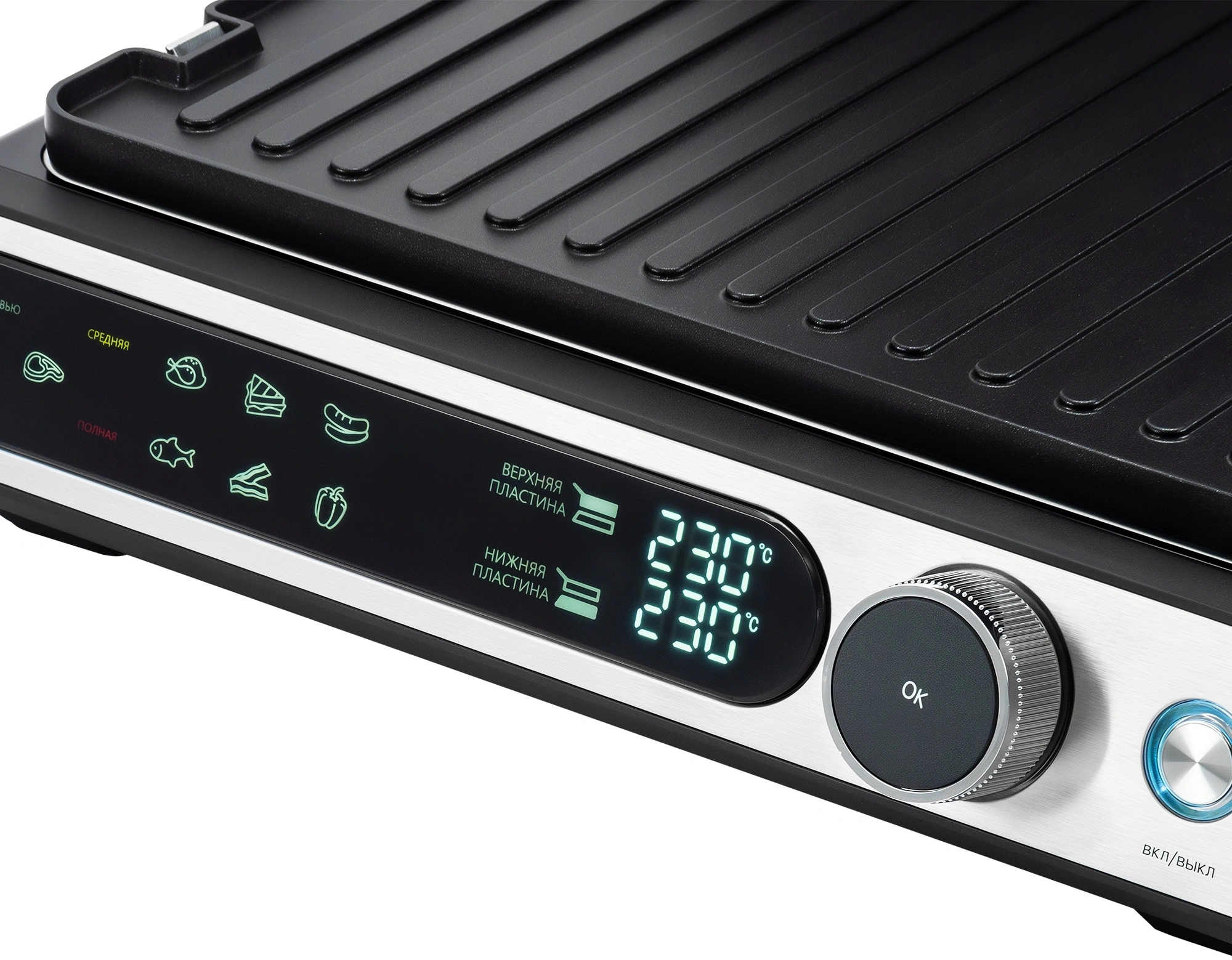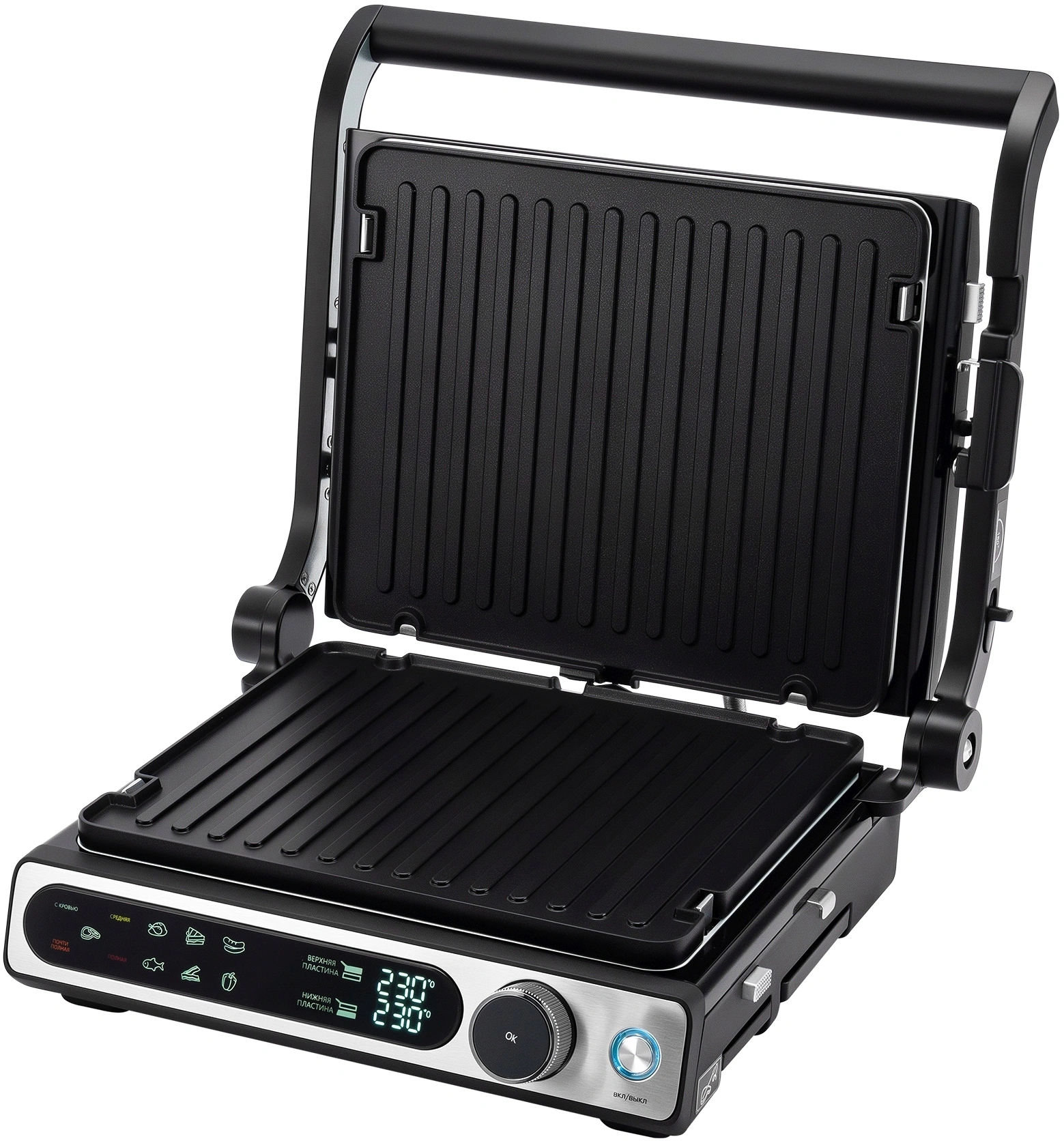 | Особенности | Интуитивное и понятное сенсорное управление всеми установками и программами. 6 автоматических программ для приготовления, а так же ручной режим, для оптимальных настроек для каждого типа продуктов, открытие на 180° для работы в режиме барбекю. |