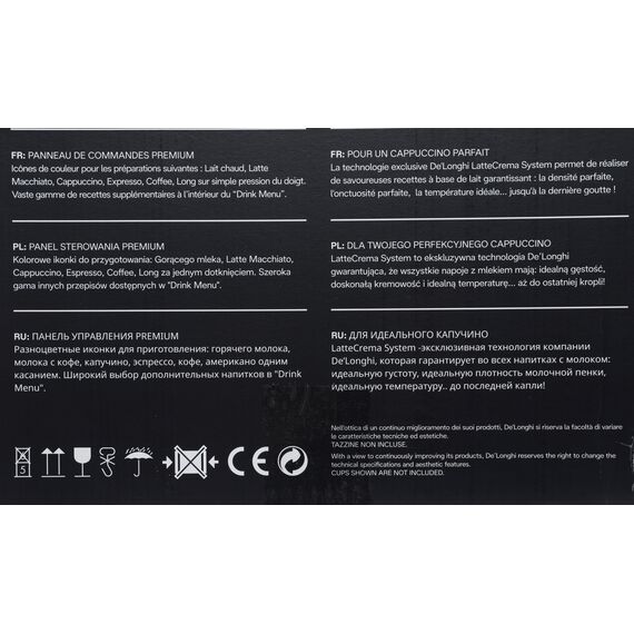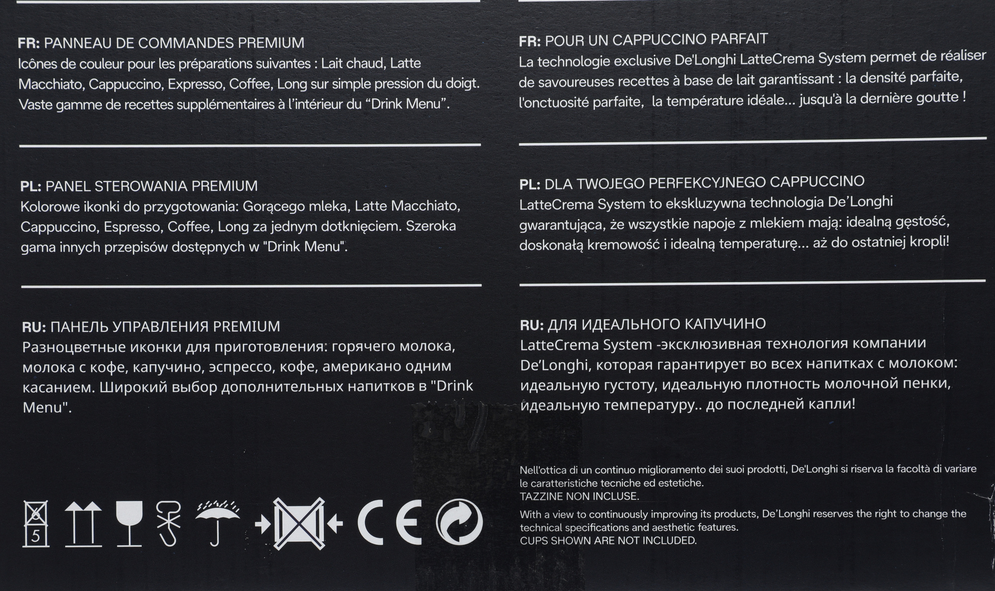 | Особенности | Персонализируйте напитки по своему вкусу: настраивайте крепость, количество молока и температуру напитков. Кофемашина Делонги запоминает и воспроизводит ваши предпочтения. Запускайте одним движением автоматическую промывку элементов молочника. |