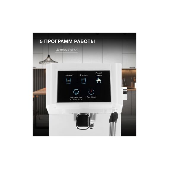 Классический форм фактор с цветными иконками на сенсорном дисплее. Программы на 1 и 2чашки, ручная программа для самостоятельного дозирования.