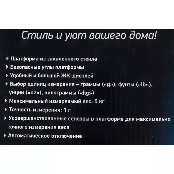 | Особенности | ЖК-дисплей, единицы измерения на выбор: граммы («g»), унции («oz»), фунты («lb») и килограммы («kg»). Прорезиненные ножки, покрытие от отпечатков пальцев. |