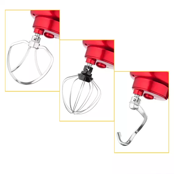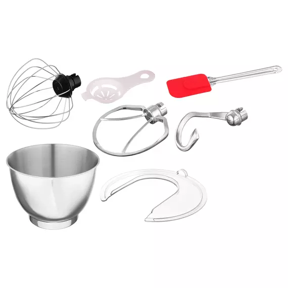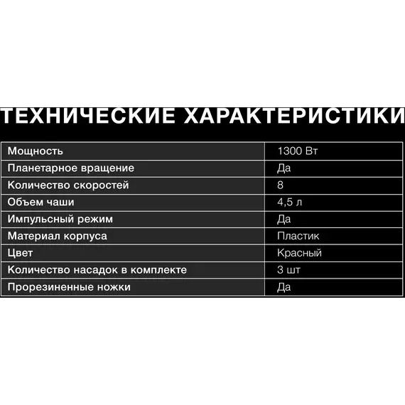 | Комплектация | Планетарный миксер; чаша; защитная крышка; насадка-венчик; насадка-крюк; насадка-лопатка; кулинарная силиконовая лопатка; сепаратор для яиц; руководство пользователя с гаратийным талоном; книга рецептов |