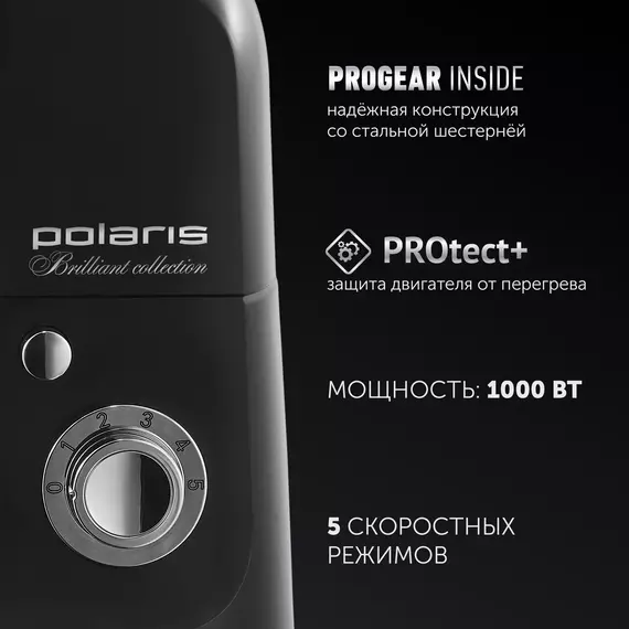 PROGEAR INSIDE надёжная конструкция со стальной шестернёй. Технология PROtect+ защита двигателя от перегрева. Чаша из нержавеющей стали. 3 в 1: Для Взбивания, Замешивания, Смешивания.