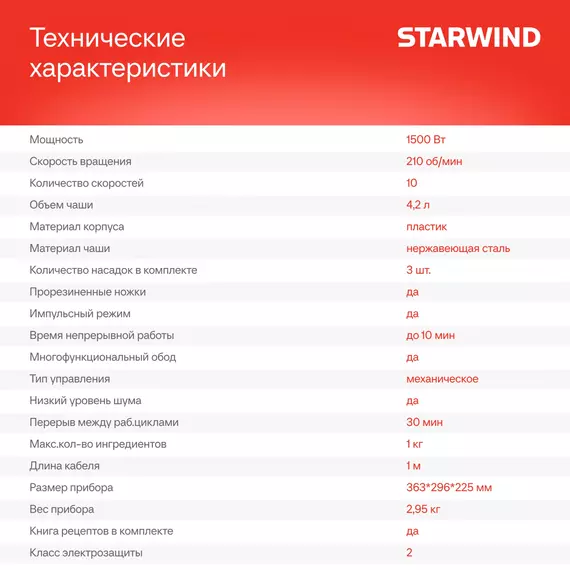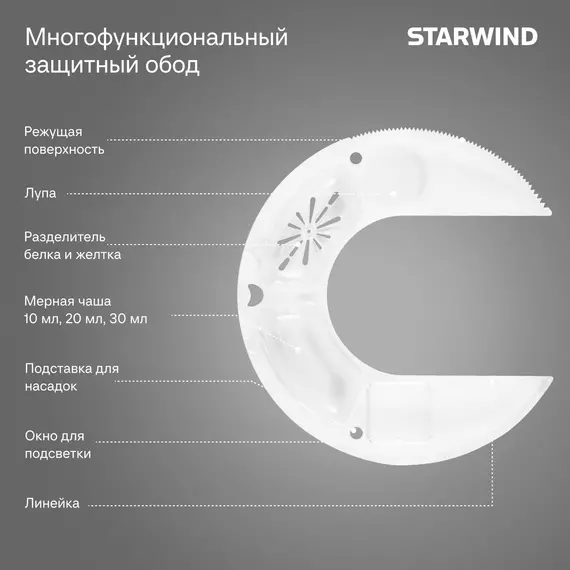 | Особенности | Мультифункциональный обод: режущая поверхность + разделитель белка и желтка + ёмкость для добавления ингредиентов + отверстие для хранения насадок + подставка под фонарик + линейка |