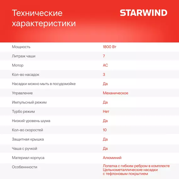 | Особенности | Низкий уровень шума; Цельнометаллические насадки, которые можно мыть в посудомойке |