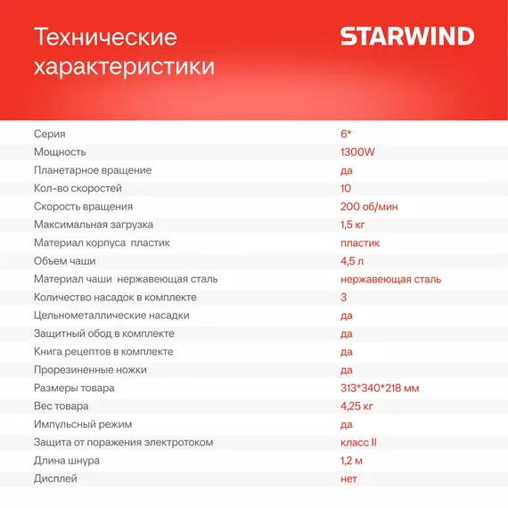 | Комплектация | миксер; чаша; защитная крышка для чаши; насадка-венчик; насадка-крюк; насадка-лопатка; книга рецептов; инструкция с гарантийным талоном |
