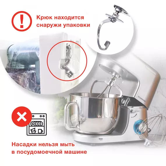 | Комплектация | миксер; чаша; защитная крышка для чаши; насадка-венчик; насадка-крюк; насадка-лопатка; книга рецептов; инструкция с гарантийным талоном |