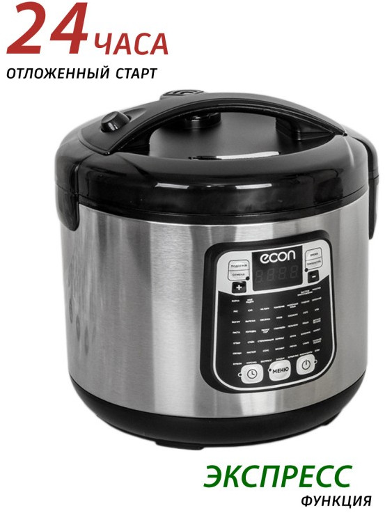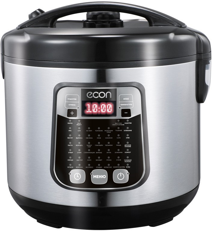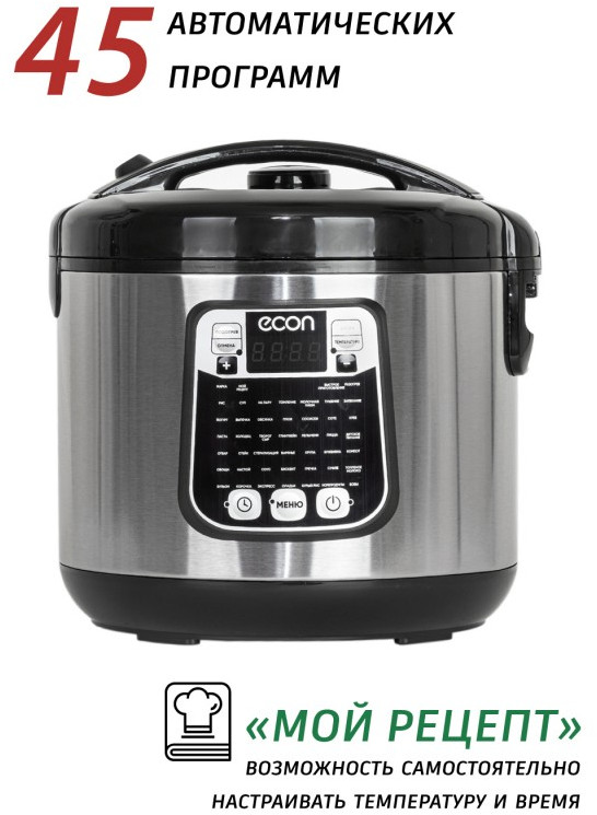 Многофункциональная мультиварка Econ ECO-53MC с электронным управлением и ярким LED дисплеем имеет 45 программ автоприготовления: мой рецепт, жарка, быстрое приготовление, разогрев, рис, суп, на пару, томление, молочная каша, тушение, запекание, йогурт, выпечка, овсянка, плов, сосиски, соте, хлеб, паста, холодец, творог/сыр, глинтвейн, пельмени, пицца, детское питание, отвар, стейк, стерилизация, варенье, крупа, буженина, компот, овощи, настой, соус, бисквит, гречка, суфле, топленое молоко, бульон, корочка, экспресс, оладьи, бурый рис, морепродукты, бобы, подогрев. Помимо этого, вы сможете использовать мультиварку для расстойки теста, приготовления фондю, стерилизации и пастеризации продуктов