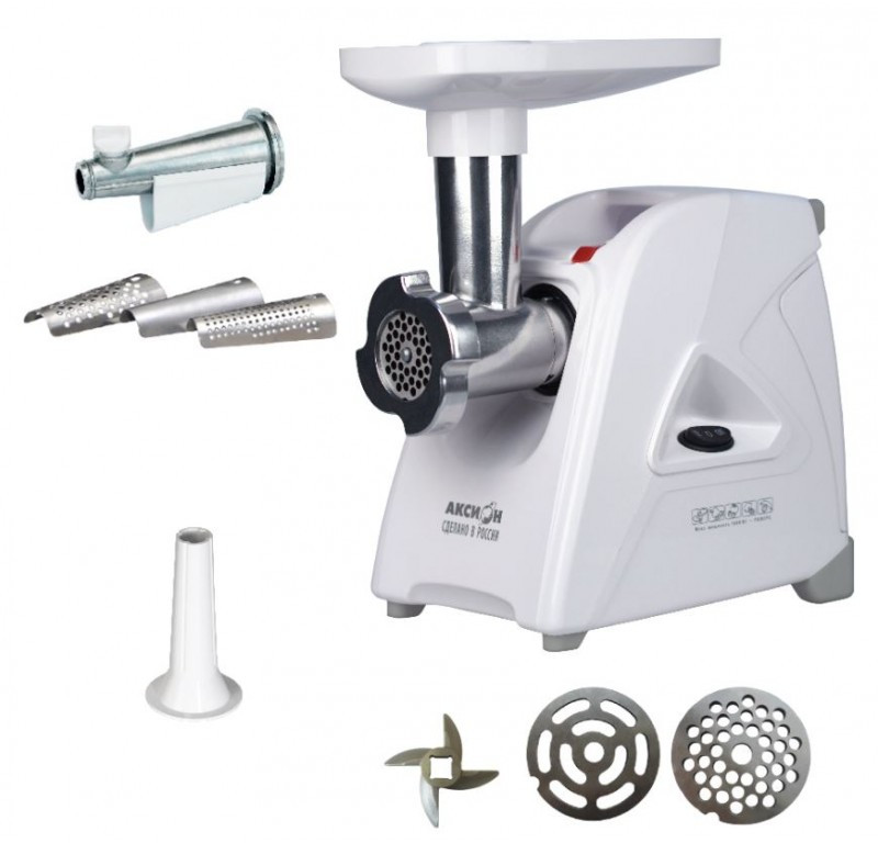 - Электрическая мясорубка М35 «Аксион» мощностью 1500 Вт обеспечит высокое качества фарша из всех видов мяса, рыбы, грибов, овощей и других продуктов. Функция «Реверс» поможет избежать наматывания жилок на шнек при переработке мяса низкого сорта