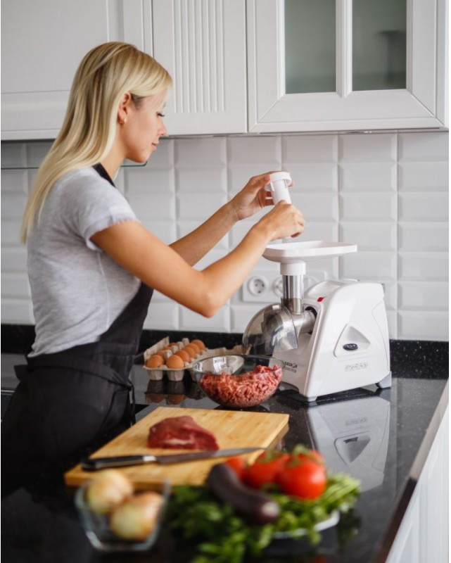 - 3 вида решеток для получения фарша разной консистенции - с диаметром отверстий 3,5 мм и 7 мм, а также овальными отверстиями