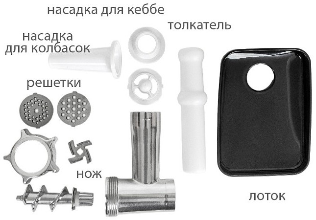 - Мясорубка, насадка для приготовления колбасок и кеббе, гарантийный талон, инструкция на русском языке