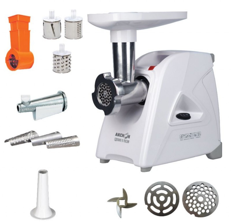 - Электрическая мясорубка М35 «Аксион» мощностью 1500 Вт обеспечит высокое качества фарша из всех видов мяса, рыбы, грибов, овощей и других продуктов. Функция «Реверс» поможет избежать наматывания жилок на шнек при переработке мяса низкого сорта