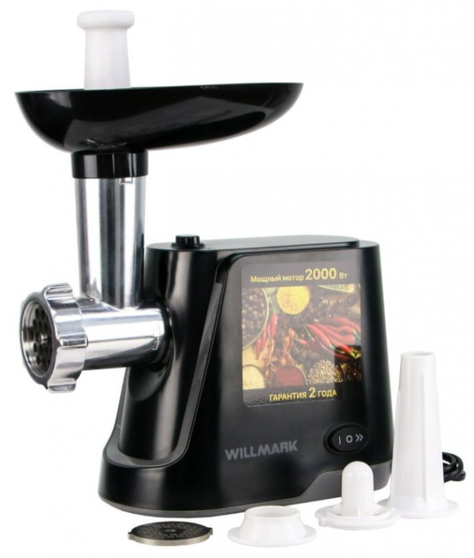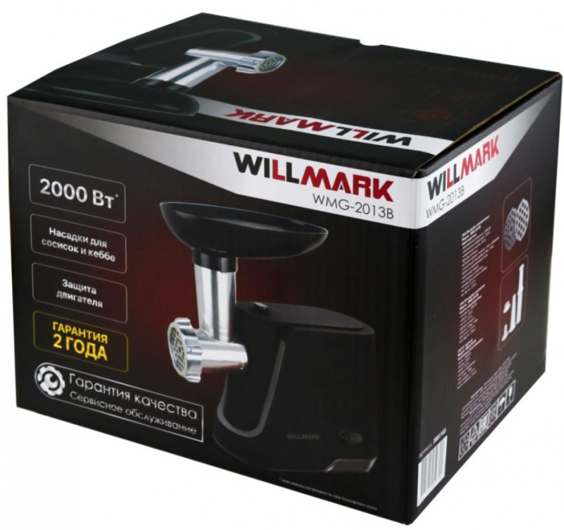 - Электрическая мясорубка WILLMARK WMG-2013B обладает расширенным набором функций и аксессуаров. В комплект прилагаются руководство по эксплуатации, две решётки для мясорубки с пропускными отверстиями 5 и 7 мм., пластиковый толкатель, насадка для сосисок и насадка «КЕББЕ».