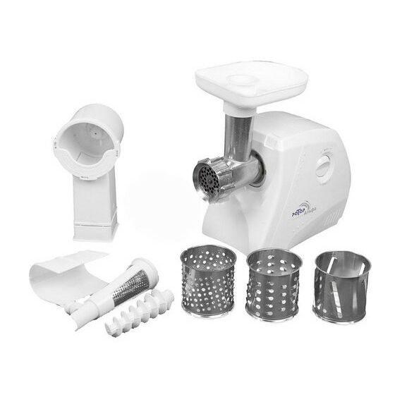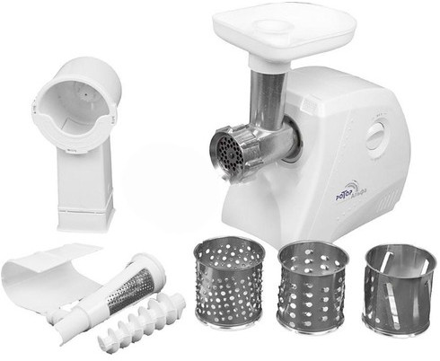 Мясорубка, перфорированный диск, 2 насадки-терки, насадка для шинковки, шнековая соковыжималка, руководство по эксплуатации, упаковка.