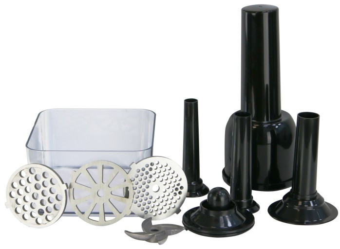 - Электрическая мясорубка с цельнометаллическим корпусом обладает расширенным набором функций и аксессуаров. В комплект прилагаются руководство по эксплуатации, три решётки для мясорубки: с пропускными отверстиями 4 и 7 мм и треугольной формы, пластиковый толкатель, насадки для сосисок и насадка «КЕББЕ»