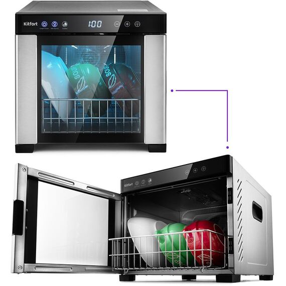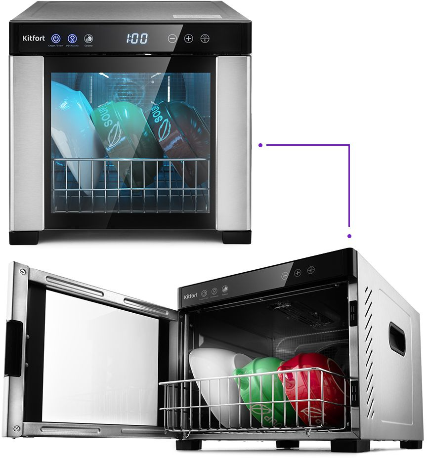 | Особенности | Помимо сушки в КТ-1916 можно сушить и одновременно дезинфицировать посуду ультрафиолетовым излучением с помощью УФ-лампы. |