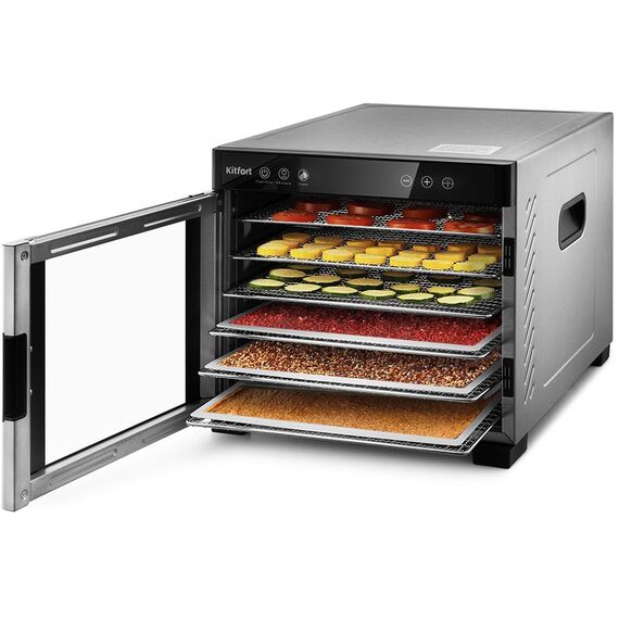 Вместительная электрическая сушилка Kitfort КТ-1916 предназначена для сушки овощей, фруктов, ягод, грибов, корнеплодов, трав и зелени, а также мяса и рыбы, хлеба. С помощью специальных сплошных поддонов можно готовить пастилу.