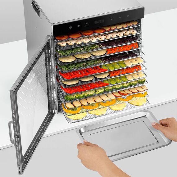 Вместительная сушилка для овощей и фруктов КТ-1951 на 12 поддонов и с прозрачной дверцей сохранит любимые фрукты и овощи полезными круглый год! Она насушит на всю зиму мясо, рыбу, помидоры, клубнику, персики, грибы, зелень, хлеб.