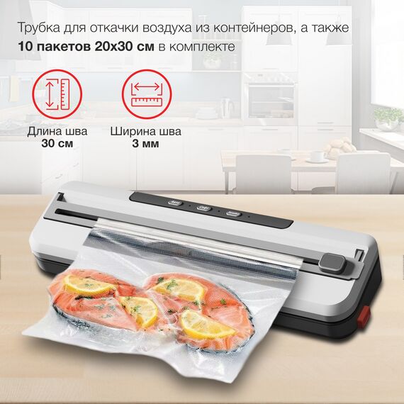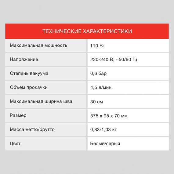 | Особенности | 4 программы, откачака 4,5л/минуту, макс. давление -65Kpa, шум 70dB, встроенный нож, насадка для вакуумации контейнеров, 10 пакетов 20*30см в комплекте. |