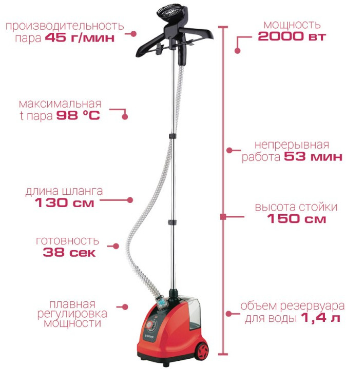 - Особенности и дополнительные функции: Абсолютно безопасен: имеет защиту от перегрева, которая, в случае повреждения термостата или отсутствия воды в баке, автоматически отключает прибор от электрической сети, Защита от скачков напряжения сети, Регулировка мощности пара, Съемный бак, Индикатор готовности работы, Два маневренных колеса для лёгкого перемещения , Легкий, компактный, маневренный