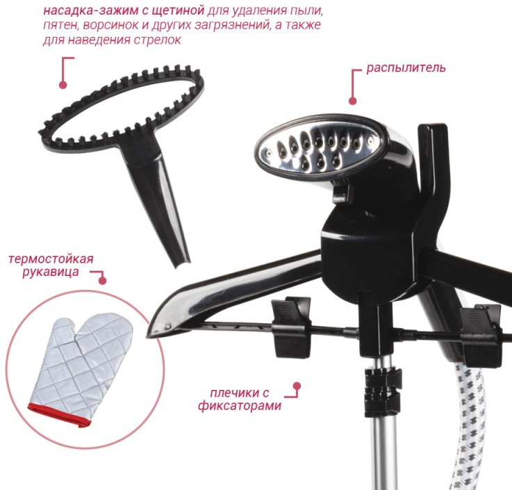 - Кроме отпаривания имеет широкий спектр возможностей, таких как очистка, дезинфекция, одежды, белья и других предметов обихода. Чистит, освежает изделия из шерсти и трикотажа, избавляет вещи от частых стирок и химчисток.