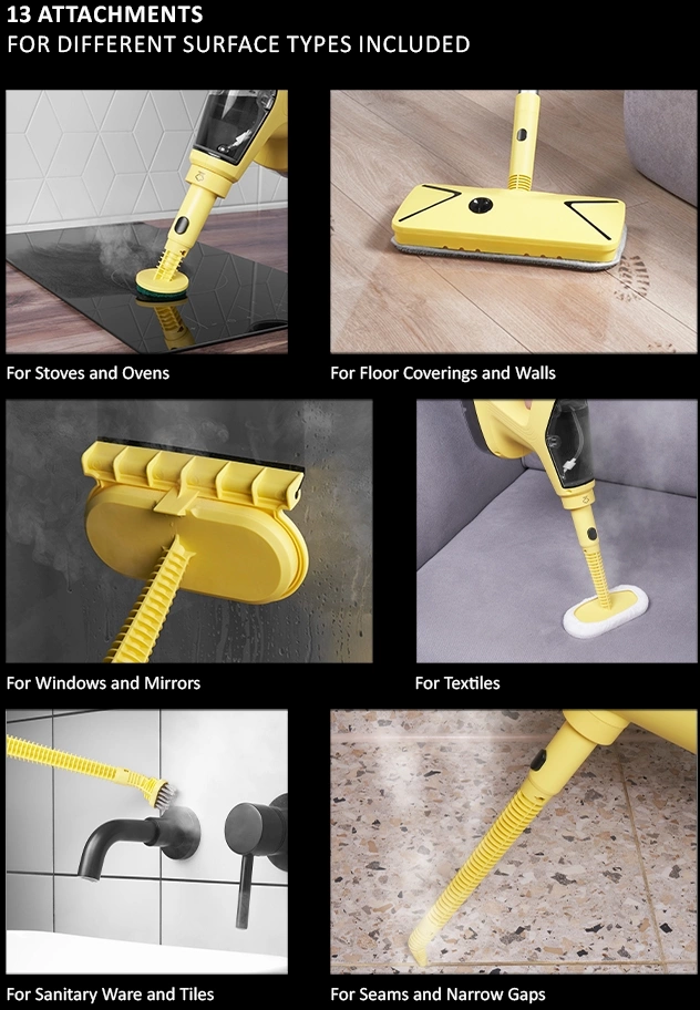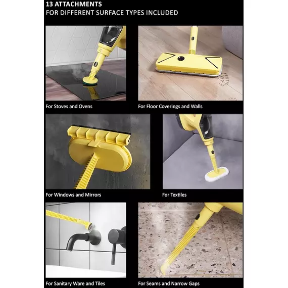 | Насадки в комплекте | Напольная швабра. Круглая щетка-губка для чистки. Мини швабра для отпаривания с текстильной насадкой. Насадка для мытья стекол и зеркал. Нейлоновая щетка. Широкая нейлоновая щетка. Щетка из нержавеющей стали. Насадка для сильных загрязнений. Изогнутое сопло. |