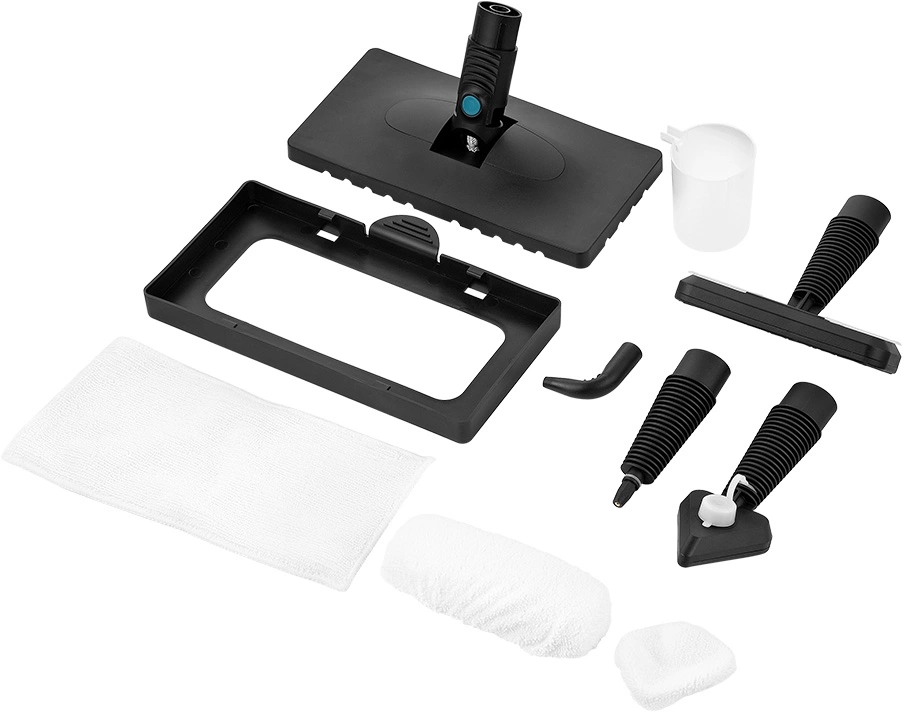| Комплектация | насадка для пола, тряпка для пола, рамка для ковра, насадка для отпаривания, тряпка для отпаривания, струйная насадка, круглая нейлоновая щетка, угловая насадка, треугольная насадка с силиконовой крышкой, мерный стакан |