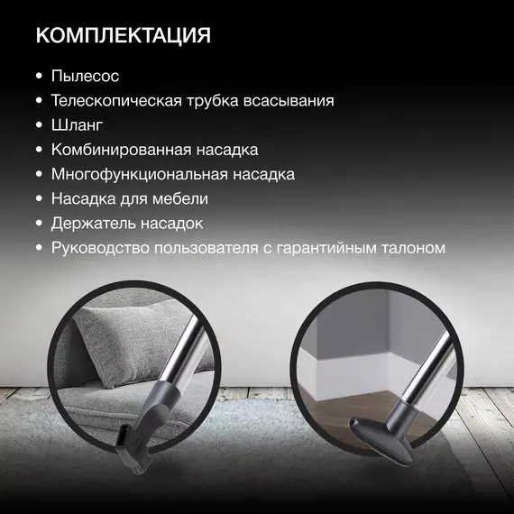 | Комплектация | насадка для пола и ковров, щелевая насадка, щетка |