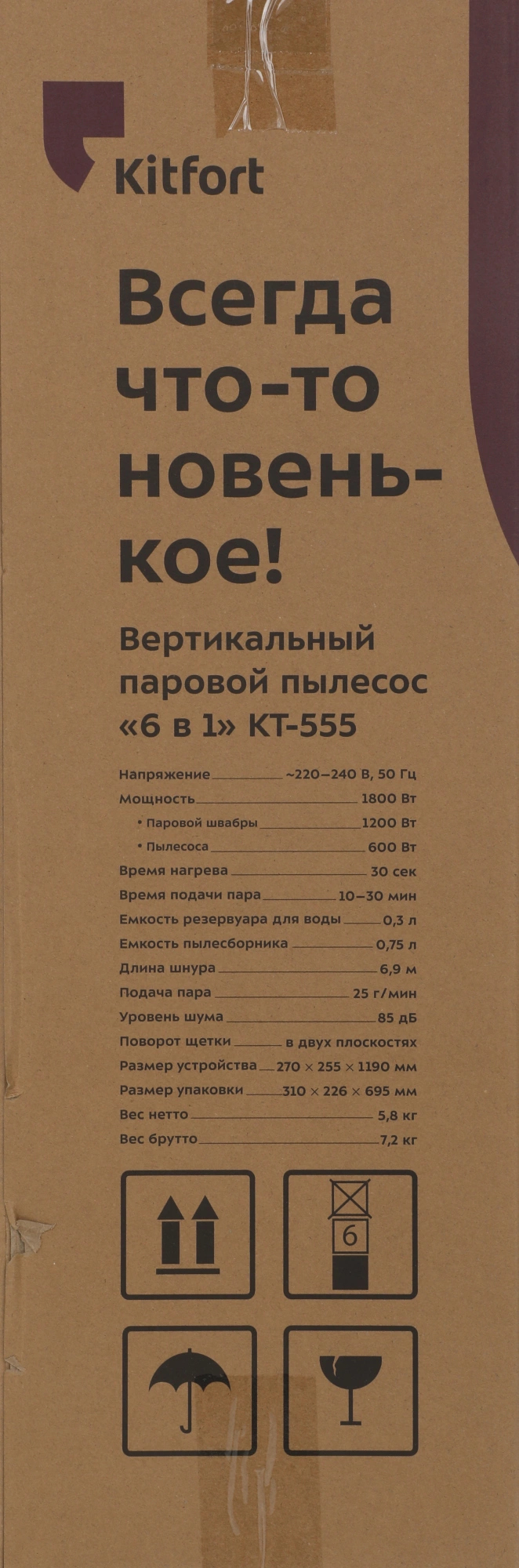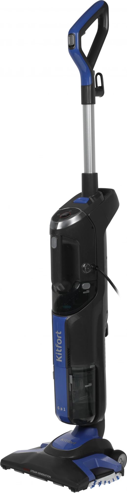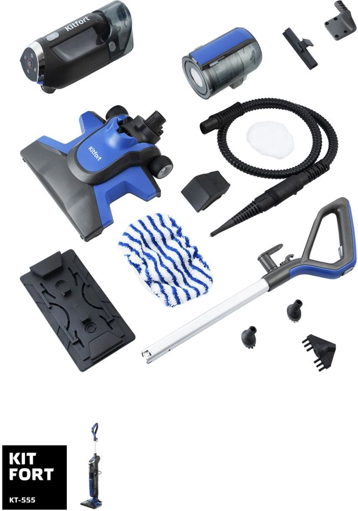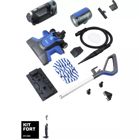 Вертикальный пылесос Kitfort KT-555 с функциями паровой швабры и ручного пароочистителя удобен при локальной и генеральной уборке. Он всасывает пыль и мелкий мусор, а затем очищает поверхность от грязи, въевшихся пятен и жира при помощи горячего пара.